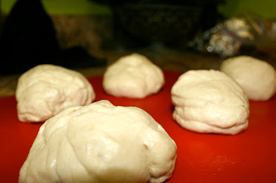 Make the french bread roll recipe and follow the steps through the first rise. Separate the dough into 6 or 7 pieces and shape into a ball. Let them rest lightly covered for 10-15 minutes to help the dough relax a bit.
